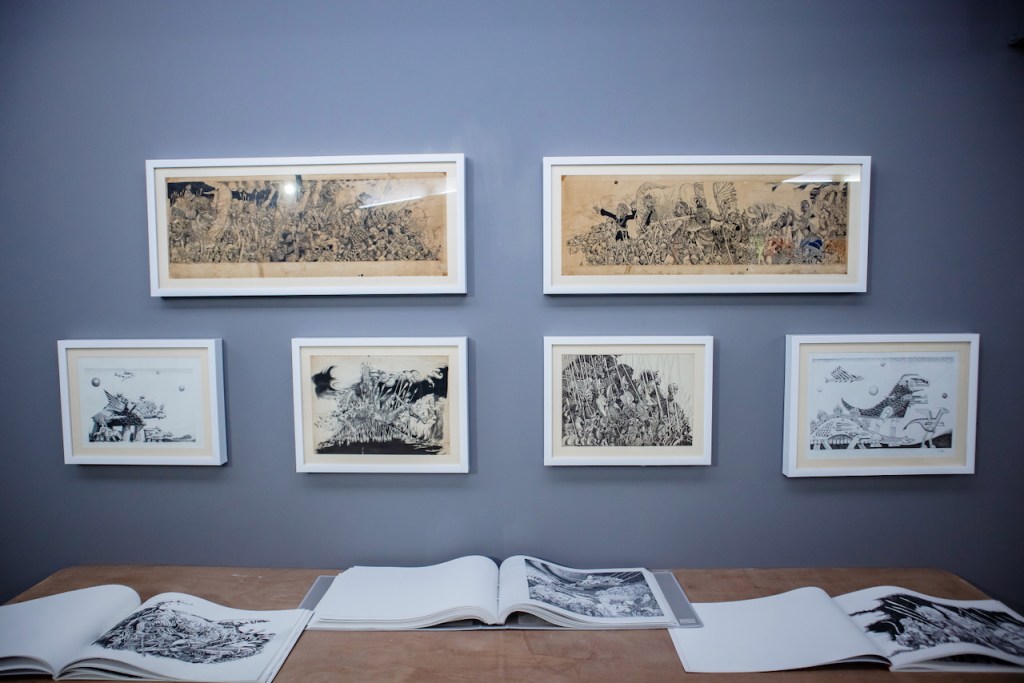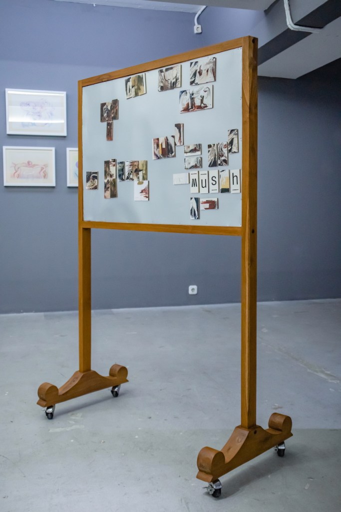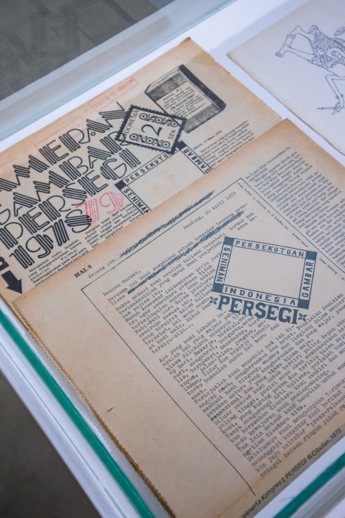 Pertanyaan serupa tumbuh, pun dapat pula diajukan pada, pameran “Gion dalam Simulasi” di RUBANAH Underground Hub. Boleh jadi kekaryaan Wagiono Sunarto berbentuk dua dimensi dan minim tekstur, terkecuali bila materialitas karya—seperti jenis kertas—memungkinkannya. Namun demikian, jejak taktilitas mengemuka di mana-mana. Gambar Gion boleh jadi pipih, tetapi ia sekaligus lengket. Satu contoh: Gambar Ilustrasi Buku Gerakan Seni Rupa Baru Indonesia 1979 yang direproduksi dengan cat akrilik di atas permukaan tiang juga dinding RUBANAH.