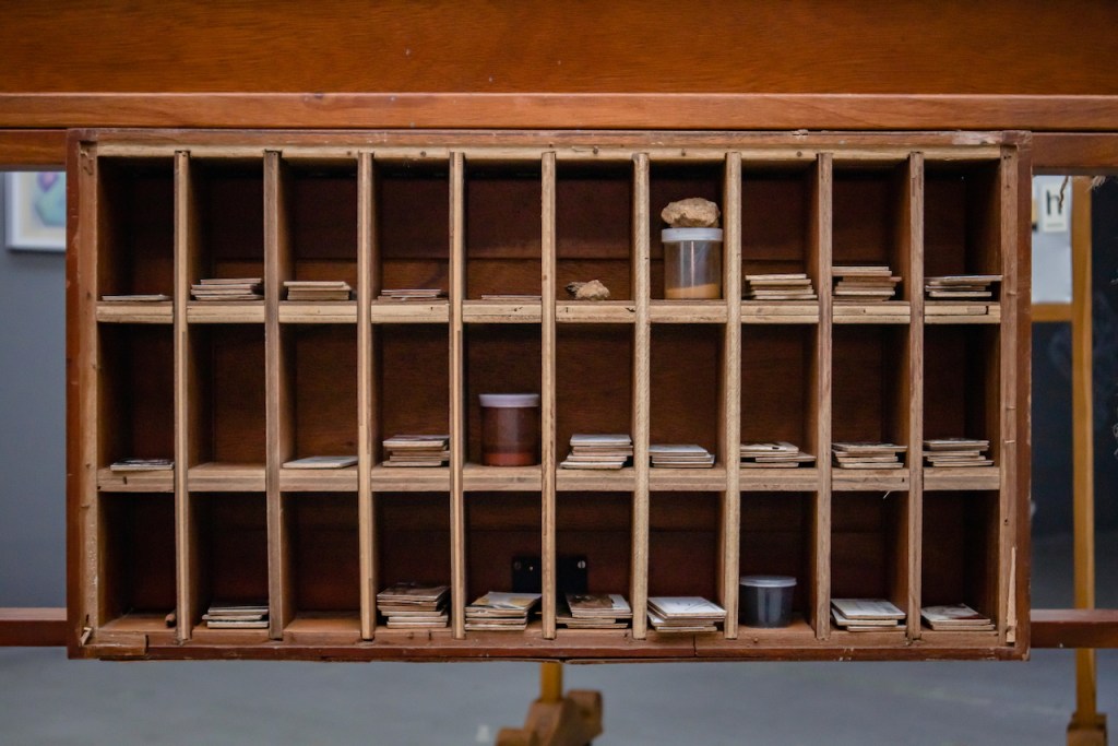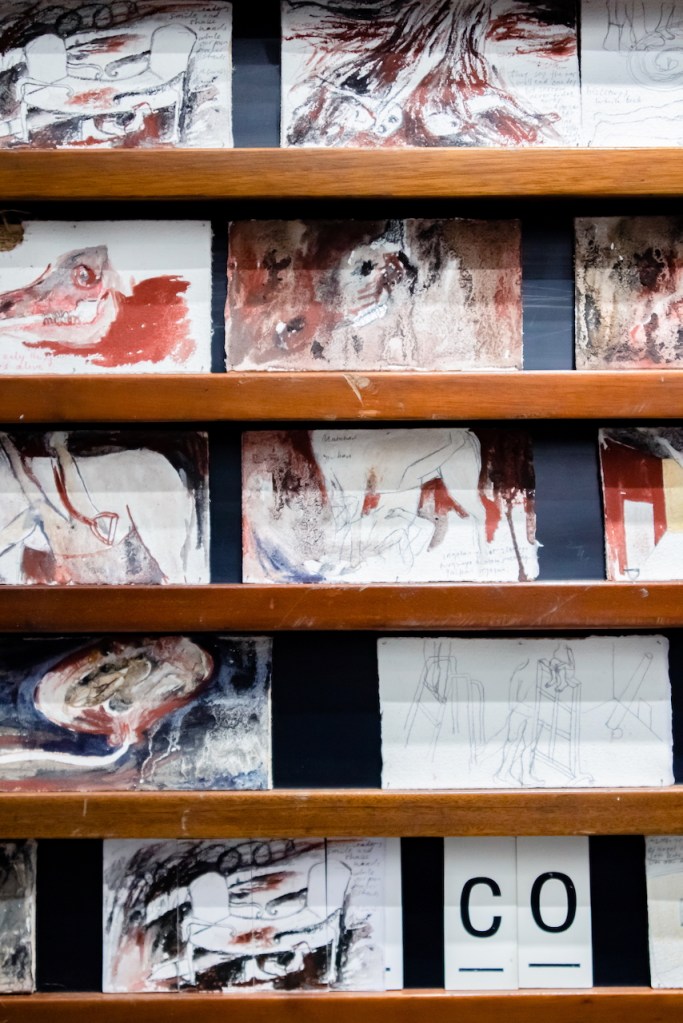 Pertama: Ipeh Nur. Karya instalasinya Bukan Perang Hitam Putih yang melintas-menyintas tema arsip karya Gion soal perang Mahabharata memungkinkan sentuhan sebagai kemungkinan. Papan indeks yang berubah jadi tempat gambar sebesar kartu pos dan huruf bermagnet ditempatkan sejajar berseberangan dengan papan lain—berplat logam ditempeli potongan-potongan gambar serupa pun huruf-huruf yang tersusun jadi satu dua kata yang telah teracak jadi sandi. Pengunjung dibolehkan mengacak-acaknya pun menambah-kuranginya dengan potongan yang tersembunyi di balik rak indeks. Salah satu kalimat dalam karyanya begitu memikat, “The gaze is the only thing that is always alive.” Ia berguna untuk menyintasi dua hal sekaligus. Bagaimana kita merespons kekaryaan hari-hari ini. Begitu pula soal “perang”—sebagai eufimisme genosida—dibiarkan tak kunjung usai dan terus-menerus turut menyandera kita menjadi saksi.