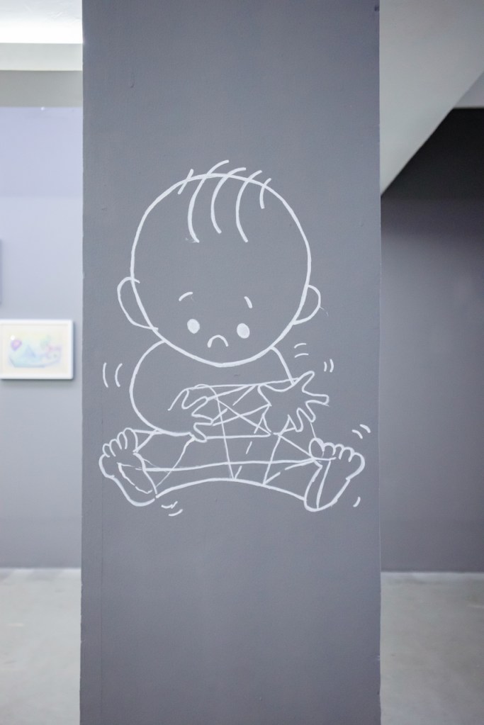 Serangkai gambar Gion ini menunjukkan figur seorang bocah dengan rambut sejumput yang bermain tali dengan elastisitas serupa karet. Di salah satu tiang yang tegak lurus dengan lantai, tampak si bocah cengok memandangi jalinan tali-karet serupa bintang yang disodorkan tangan dewasa padanya. Di tiang yang lain, si bocah tampak duduk cemberut dengan tali yang melilit tangan dan kakinya. Sedangkan di dinding, ia tampak salah tingkah terjerat oleh tali yang melingkupi tubuhnya sendiri. Di gambar terakhir si bocah tampak riang gembira di tengah carut marut sepuluh orang dewasa—dalam ekspresi tidak nyaman di tengah jerat tali yang sama—kecuali satu orang dewasa berkacamata hitam yang tampak berbagi kesenangan dengannya.