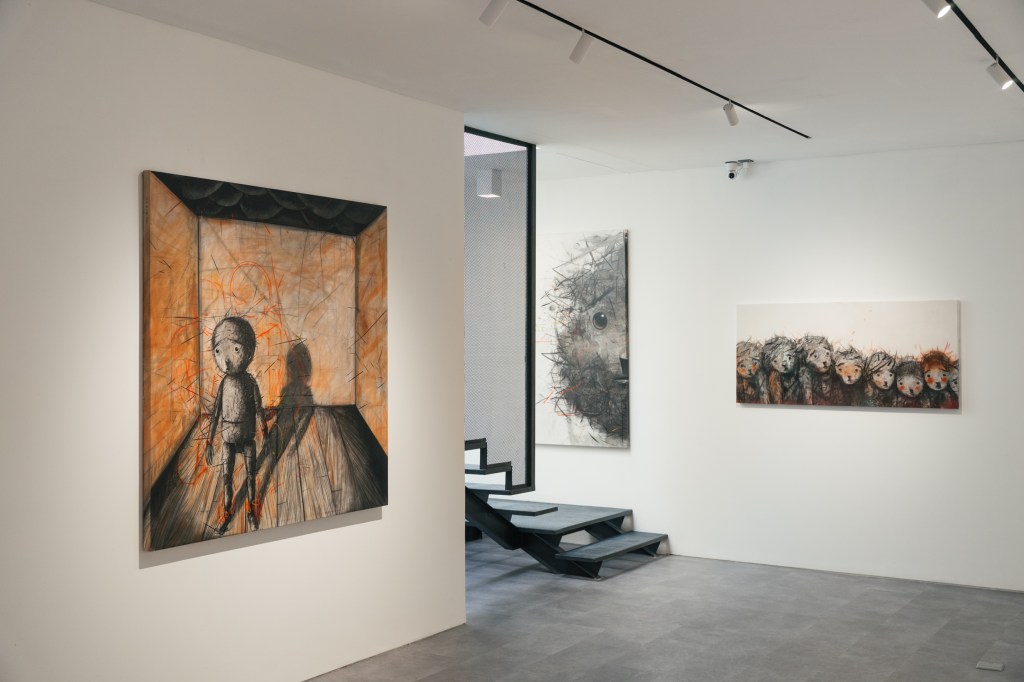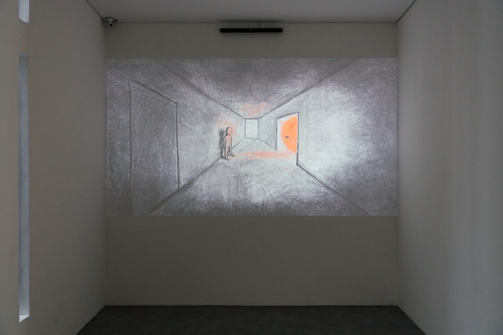 Die räumliche Aufteilung von Fig unterbricht das Tempo der Ausstellung in zwei Hälften, oben (Ausstellungsraum) und unten (Fokusraum). Wenn man sich die kuratorischen Notizen von Once Was ansieht, versucht ara, die transformative Dimension des Puppentheaterspiels auf der Ebene der „vergangenen Handlungen“, die eine undurchsichtige Spur hinterlassen, zu diskutieren. Mit anderen Worten: Mit dem Verschwinden des Puppenspielers aus den Köpfen der Zuschauer auf die Bühne findet Iwan auch einen Rest von Bewegung durch die Verwendung einer visuellen Sprache: den grauen Fleck einer ausradierten Kohlezeichnung. Im ersten Stock wird dieser Rahmen enger gefasst, indem ein Stop-Motion-Video anstelle der vielen Zeichnungstafeln im Raum präsentiert wird. Das Video mit dem Titel wanting to hold needing to let go (2025) zeigt eher eine projizierte Geschichte als den grauen Fleck, den der Betrachter nur erleben kann, wenn er sich die 7 Zeichnungen im ersten Stock ansieht. Iwan sagte, dass er an dem Video mit einer Zählung von 10 Bildern pro Sekunde oder 10 Mal Zeichnen und Löschen für jede Sekunde gearbeitet hat, um ein Video von ungefähr einer Minute sieben Mal zu produzieren. Was das Thema betrifft, so lässt Iwan den Ballast des Designs oder des Konzepts los, sondern bezieht sich auf Stimulanzien außerhalb seiner selbst, wie z. B. Nachrichten oder Input von seinem Sohn. Wir können das Ergebnis oder die Spuren von Stop-Motion mit den visuellen Effekten in Marcel Duchamps Nude Descending a Staircase, No. 2 (1912) vergleichen, wenn es darum geht, den Eindruck von Bewegung durch die Überlagerung visueller Elemente zu vermitteln. Der filmische Effekt, der durch den Abstand von Bild zu Bild entsteht, wird von Iwan nicht nur genutzt, um Bewegung zu vermitteln, sondern greift auch in das Papiermaterial ein, auf das er zeichnet, und zwar mit dem visuellen Effekt eines gräulichen Flecks als Erinnerung an die Bewegung, der genau die Verlassenheit des Puppenspielers ausdrückt.