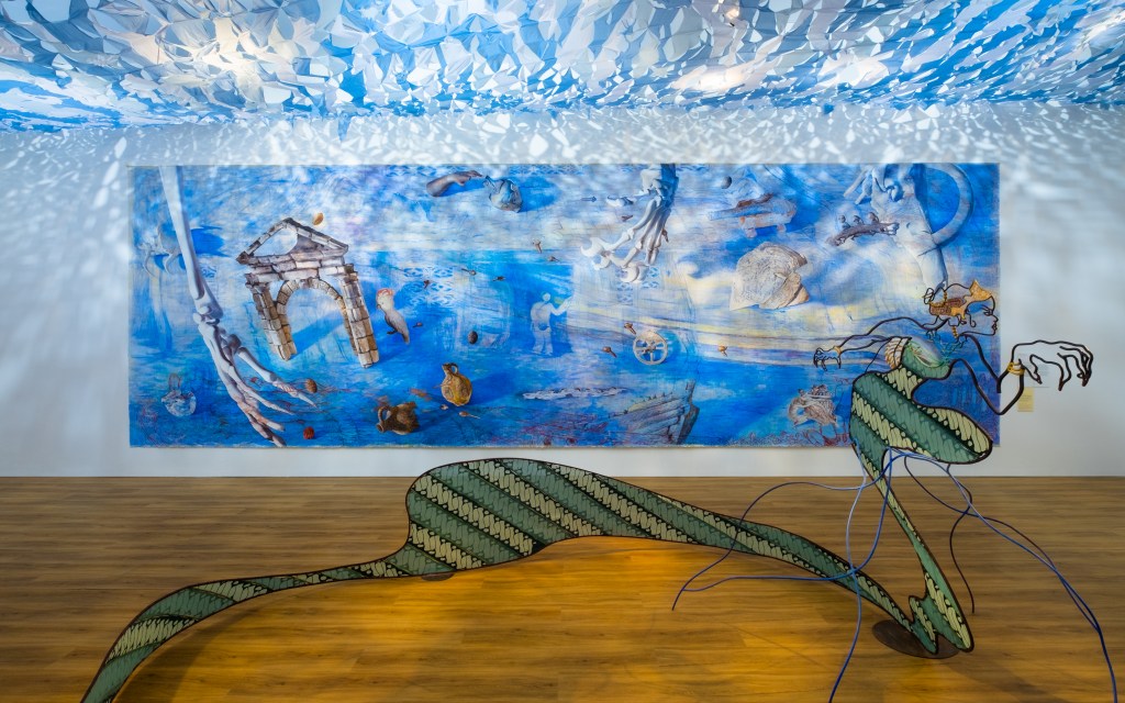 Atmosfer ruang diperkuat oleh kain bergelombang di langit-langit. Bayangan yang jatuh menyerupai riak laut, membuat seluruh karya seolah berada di bawah permukaan air—tempat ingatan terendap lalu muncul kembali.