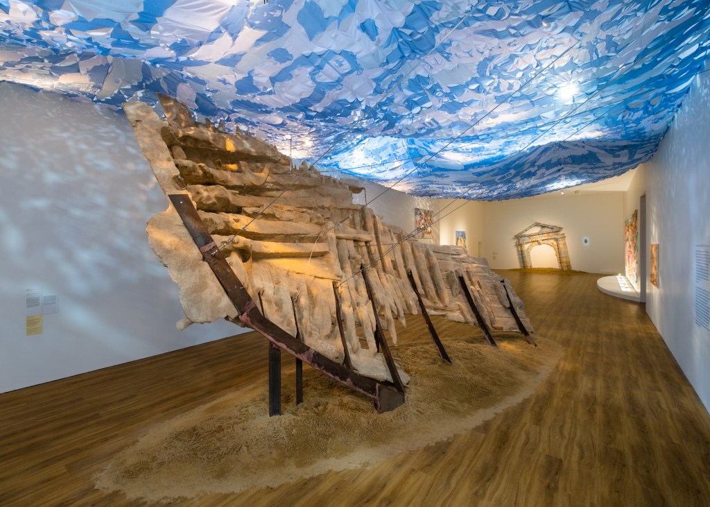 Narasi kedua berpusat pada tragedi karamnya kapal Batavia tahun 1629 di perairan Australia Barat. Instalasi Batavia Ship (2025) menampilkan kerangka kapal dari resin, kain, dan pasir—lebih mirip reruntuhan daripada simbol kejayaan. Di ujung ruang, Slanted Portico of the Batavia Fort (2025) menghadirkan rekonstruksi gerbang batu VOC dalam posisi miring, lambang ambisi kolonial yang digagalkan oleh ganasnya laut.